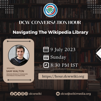 The July 2023 DCW Conversation Hour aimed at exploring the role of The Wikipedia Library (TWL) in the global Wikimedia movement. TWL is an open research hub through which active contributors on Wikimedia projects gain access to the important reliable but paywalled sources for free in order to improve the encyclopedia.